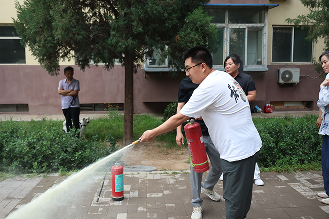 為確保演練成效,中心事前制定了周密的方案,明確現(xiàn)場應(yīng)急救援小組分工,下設(shè)報警聯(lián)絡(luò)、醫(yī)療救護、滅火行動、疏散引導四個工作組。警報拉響一刻,安全生產(chǎn)部率后勤引導組迅速抵達現(xiàn)場,辦公區(qū)員工立即反應(yīng):濕毛巾掩口鼻、壓低身姿,沿著預(yù)定路線快速有序疏散至室外安全點。與此同時,地礦小區(qū)中心廣場模擬火情燃起。參訓人員在專業(yè)培訓員指導下,掌握“提、拔、握、壓”關(guān)鍵要領(lǐng),手持滅火器對準火源根部精準噴射,迅速控制了“火勢”,并在指導下輪番實操。