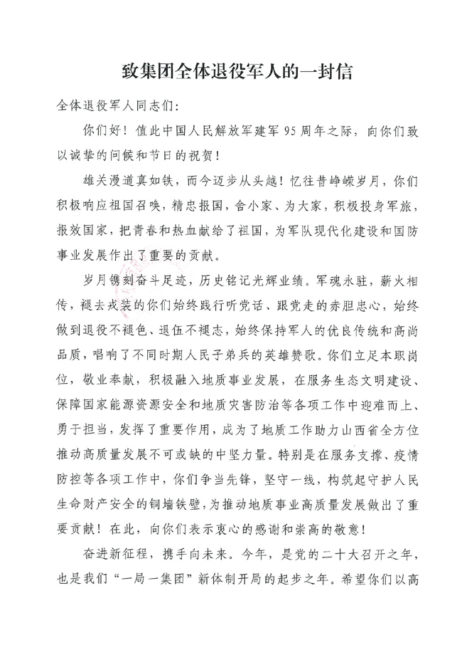 山西地質(zhì)集團(tuán)致集團(tuán)全體退役軍人的一封信