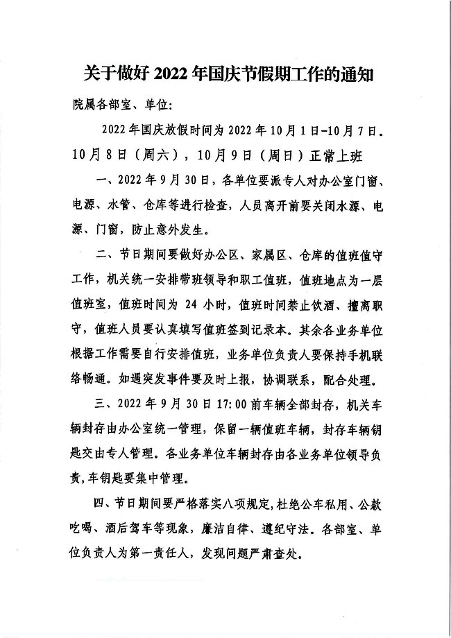 關(guān)于做好2022年國慶節(jié)假期工作的通知