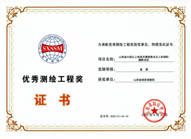地調(diào)院有限公司測繪地理信息技術(shù)研究院承擔(dān)的《山西省大型以上地質(zhì)災(zāi)害隱患點(diǎn)無人機(jī)傾斜攝影》項目獲得2022年度優(yōu)秀測繪工程獎金獎。