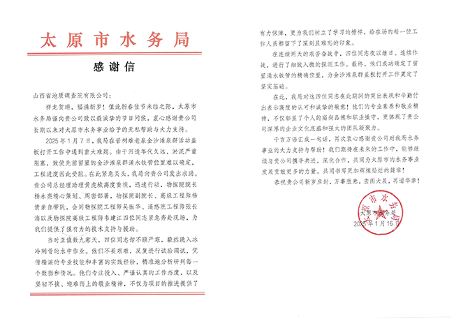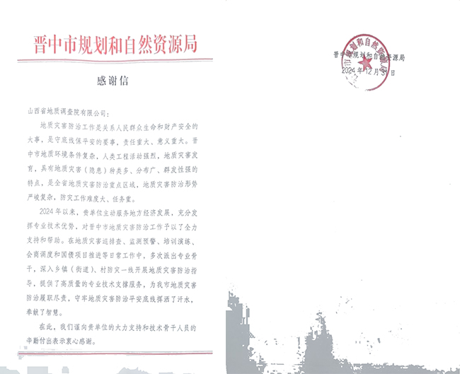 近期,公司收到來自政府、地方以及行業(yè)部門等多方的感謝信,信中均對地調院有限公司專業(yè)能力、人才實力與社會責任感給予了高度贊揚。
