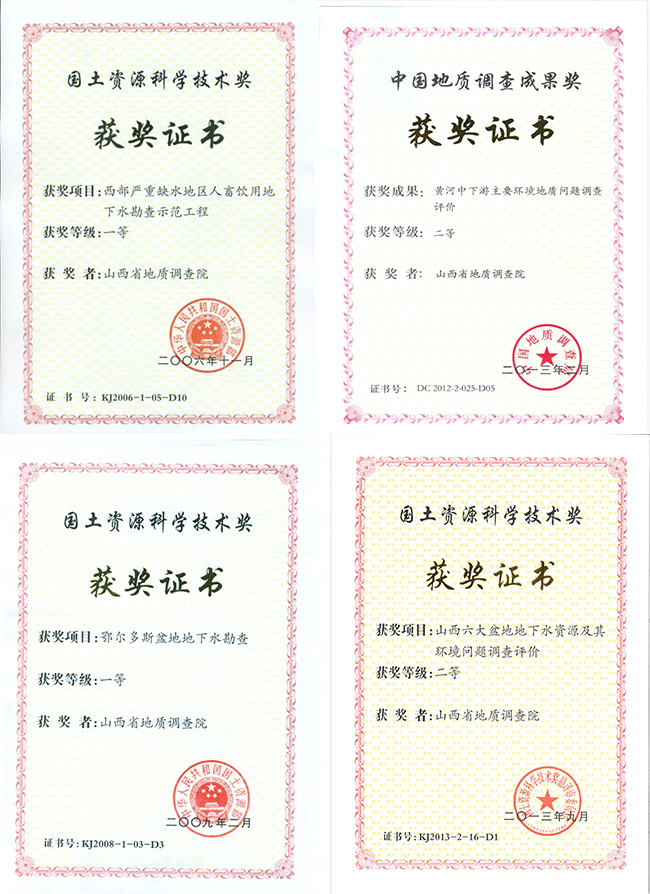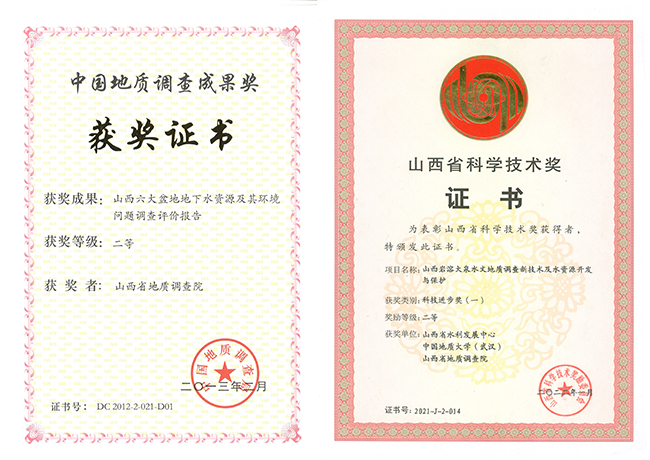 在水文地質(zhì)調(diào)查方面,《西部嚴(yán)重缺水地區(qū)人畜飲用地下水勘查示范工程》、《鄂爾多斯盆地地下水勘查》項目獲國土資源科學(xué)技術(shù)一等獎,《山西六大盆地地下水資源及其環(huán)境問題調(diào)查》評價項目獲國土資源科學(xué)技術(shù)獎二等獎和中國地質(zhì)調(diào)查成果獎,《黃河中下游主要環(huán)境地質(zhì)問題調(diào)查評價》項目獲中國地質(zhì)調(diào)查成果,《山西巖溶大泉水文地質(zhì)調(diào)查新技術(shù)及水資源開發(fā)利用與保護》項目獲2021年度山西省科學(xué)技術(shù)二等獎。2023年新開展《山西省岢嵐縣飲水解困1:5萬水文地質(zhì)調(diào)查》工作,提高區(qū)域水文地質(zhì)調(diào)查精度,為區(qū)域發(fā)展提供水源保障。